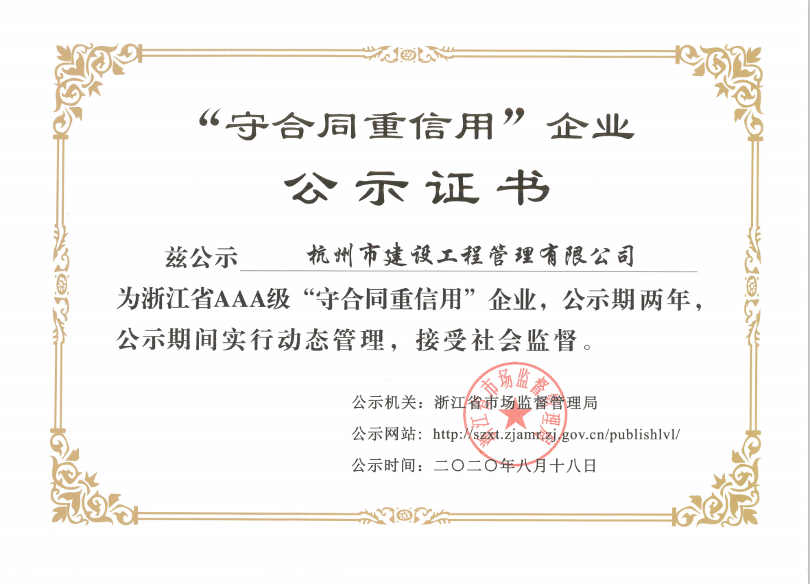 杭州市建設(shè)工程管理有限公司榮獲2020年浙江省AAA級“守合同重信用”公示證書,不僅證實了杭建“不信不立,不誠不行”一諾千金的企業(yè)行為,而且證明了杭建人在砥礪前行的道路上工作井然有序與有條不紊,我們將堅持以嚴(yán)謹(jǐn)?shù)墓ぷ鲬B(tài)度、實事求是、科學(xué)公正的立場,致力于招標(biāo)代理和造價咨詢事業(yè)。公司全體員工衷心感謝廣大新老客戶對公司發(fā)展的支持和幫助!